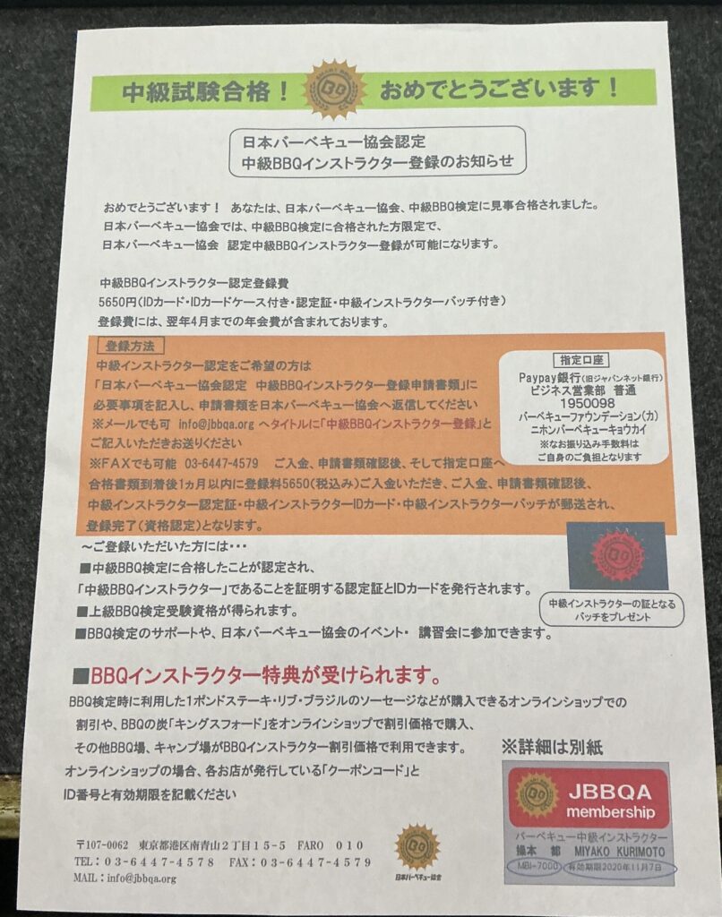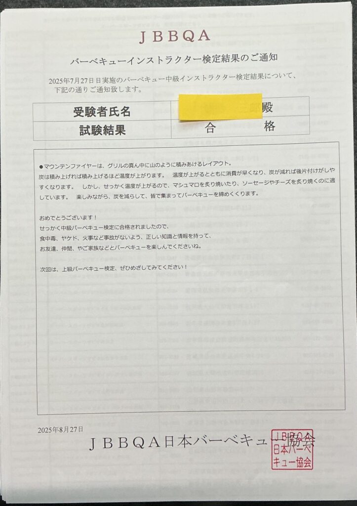 先日受験した日本バーベキュー協会の中級検定。無事に「合格」の通知をいただきました。
