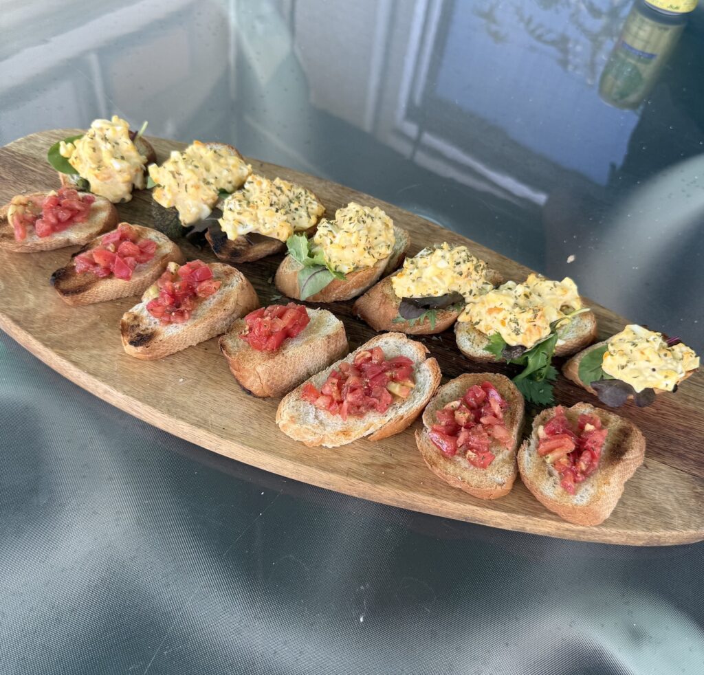 テーブルに並んだのは、フレッシュなトマトのブルスケッタ、濃厚なエッグブリスケッタ、そしてBBQ協会オリジナルのチップス。