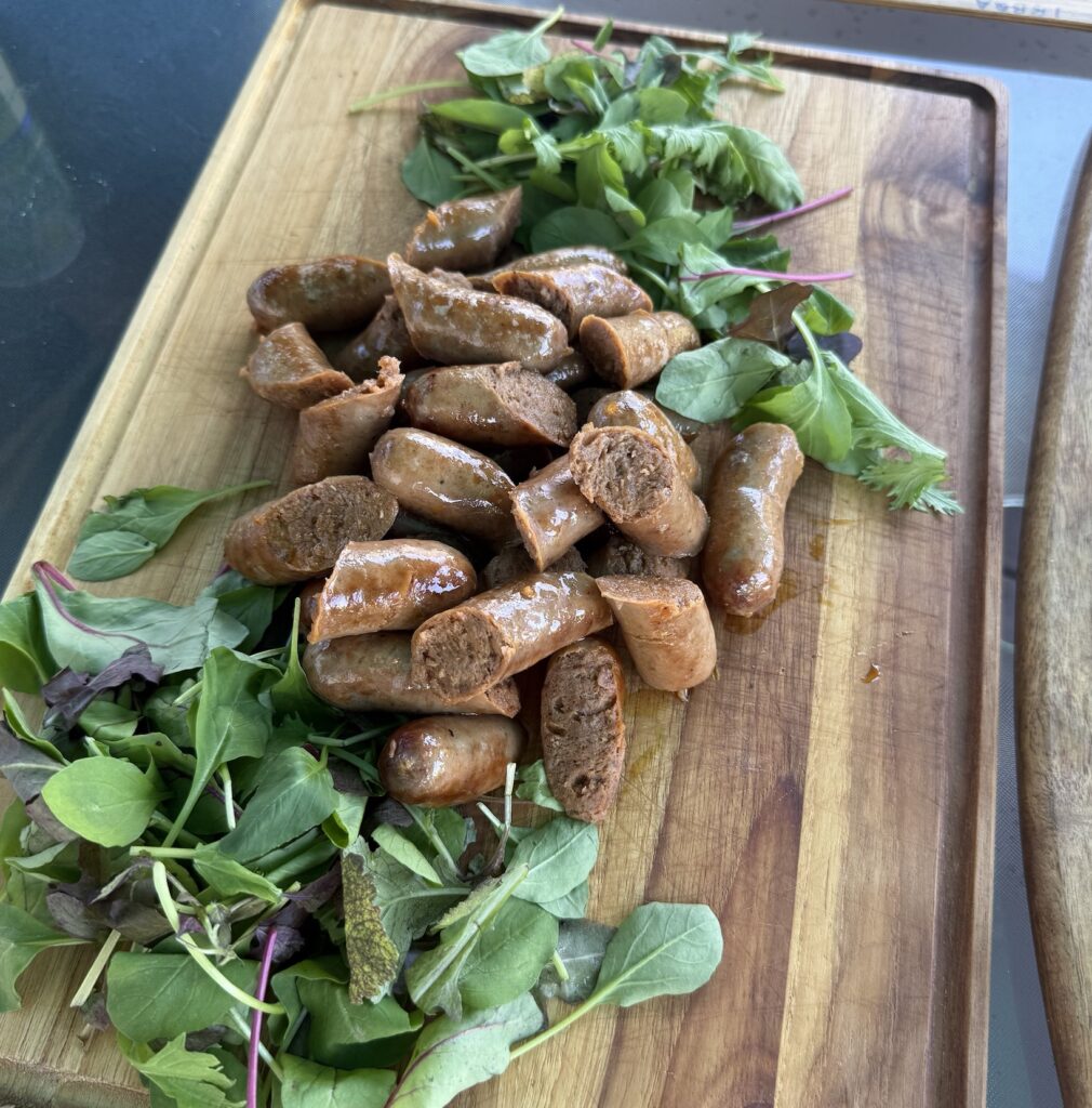 ジューシーなソーセージにカリッとしたナチョスの食感が重なり、そこに甘酸っぱいブルーベリーソースをかけるという組み合わせ。  (ソースが映ってませんが・・)