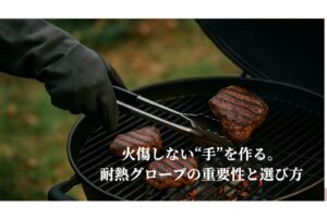 火傷しない“手”を作る。耐熱グローブの重要性と選び方 BBQで最も過酷な環境にさらされるのは、実は「手」です。炭の温度は300〜500℃、鉄製グリルの蓋は触るだけで火傷レベル。一瞬の油断が“火との距離”を見誤らせます。 おし...