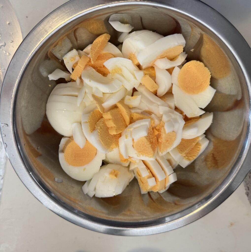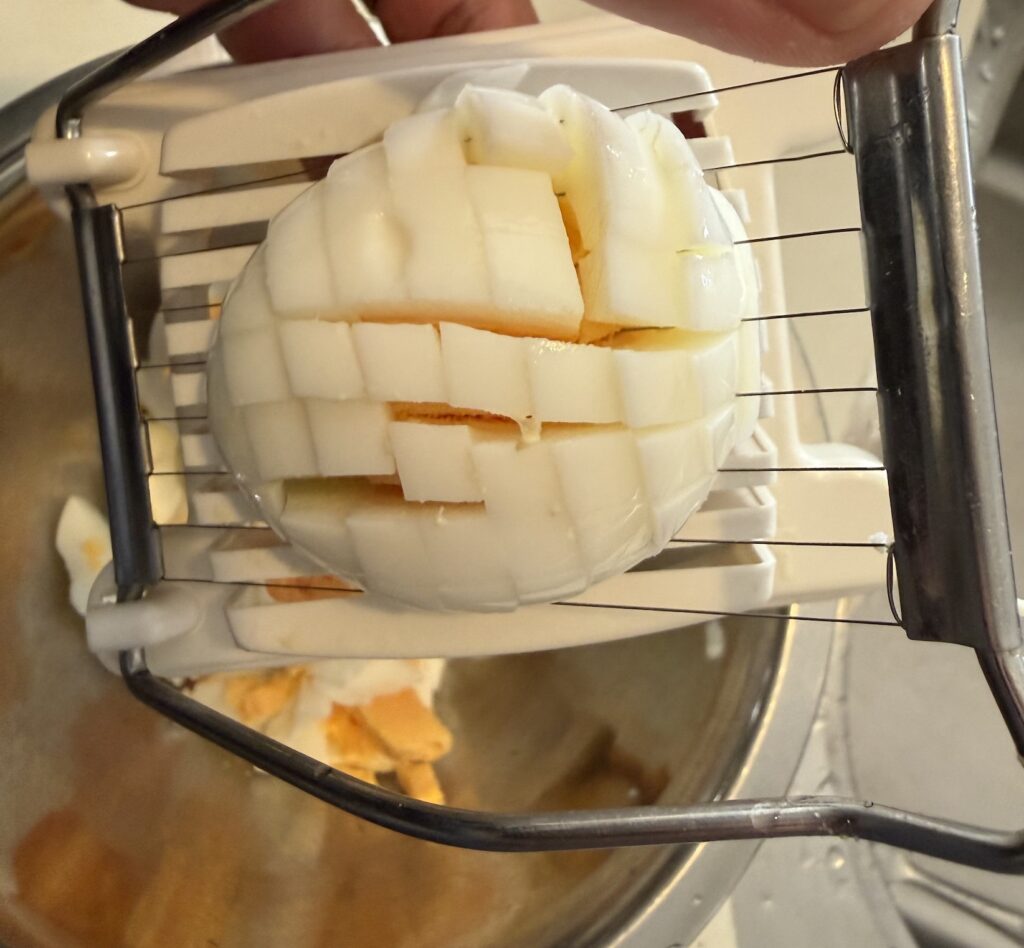 卵をゆでて、粗めにカットします(※写真のようにスライサーで大きめに切るのがポイント)。