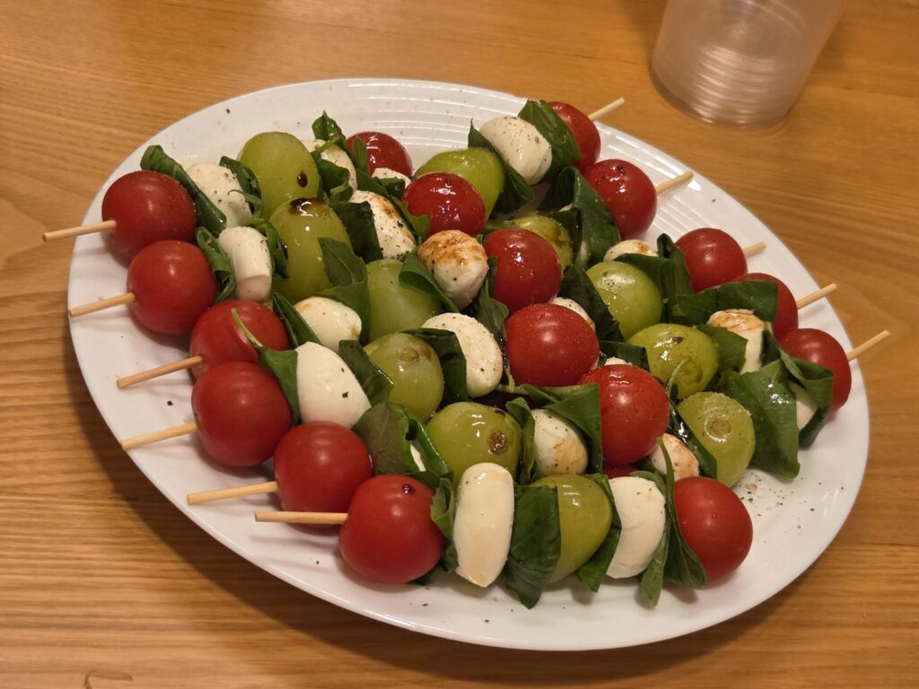 🍅ピンチョスは、ミニトマト、モッツァレラ、マスカット、バジルを串に刺し、オリーブオイルとバルサミコを軽く垂らした爽やかな一品。