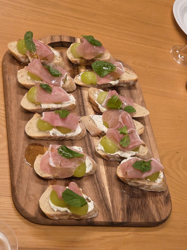 🍇ブリスケッタは、生ハムとマスカットをのせた“和モダン”な前菜。マスカットの瑞々しさが生ハムの塩味を引き立て、雨音を忘れさせてくれるような上品な味わいだった。
