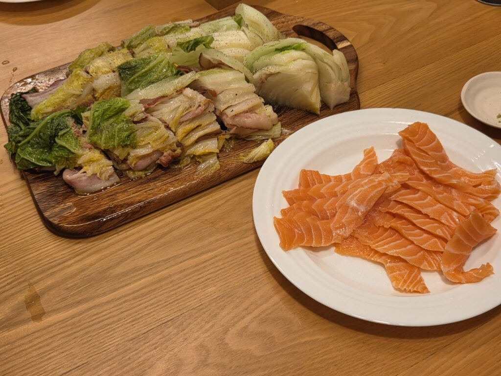 白菜とベーコンのミルフィーユ:重ね焼きでしっとりジューシー、肉の脂が白菜に染み込む。