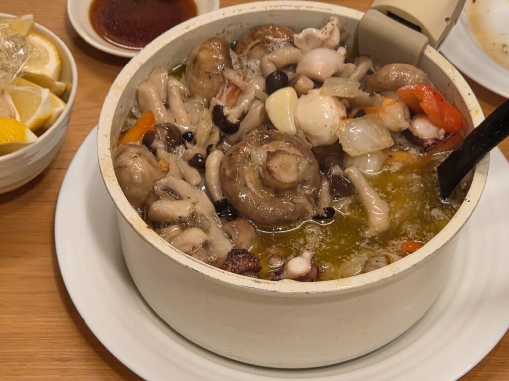 シーフード・ガーリックアヒージョ:タコ、ホタテ、マッシュルームがぐつぐつと踊り、
