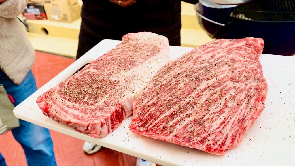 メインはもちろんA5ランクサーロインステーキ。分厚い肉が炭の熱でじわじわと色づいていく様子は、見ているだけで言葉を失うほどの美しさ。焼き目がついた瞬間、全員の顔が一斉に笑顔になります。