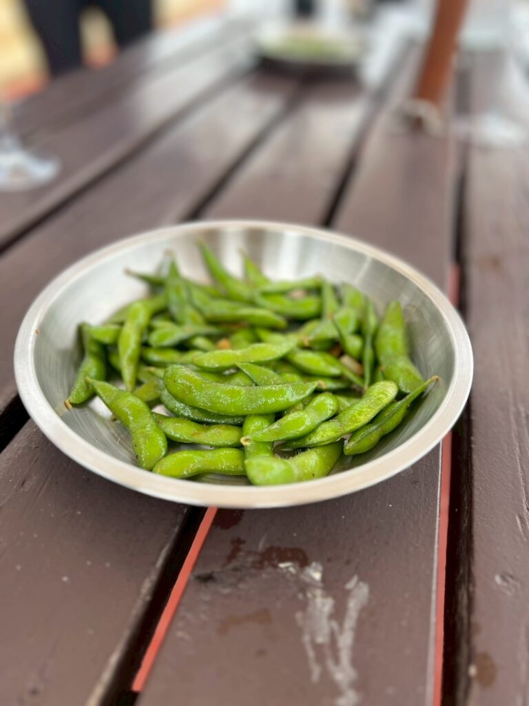 まずは枝豆のペペロンチーノでスタート。にんにくの香りが立つたびに食欲が刺激され、潮風と混じり合ってたまらない香ばしさ。