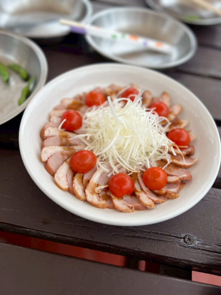 次は鴨肉のマリネ。脂がじゅっと音を立てて、炭の上で輝くように焼き上がります。ひと口噛むと、鴨の旨みがじんわり広がって、クルーズの余韻にぴったりの深い味わいでした。