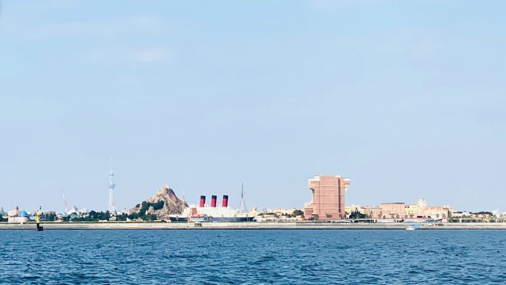 小型船ならではのスピード感。波を切るたびに風が顔にあたって、気づけば笑いっぱなし。浦安を離れて海に出ると、左手にはディズニーシーの景色が広がります。テーマパークを“海側から”見るという新鮮さにワクワクが止まりません。
