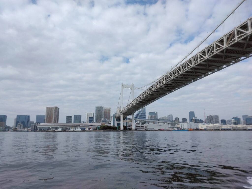 レインボーブリッジの下をくぐる瞬間は圧巻。橋の下の影に入ったかと思えば、一気に光が差し込む。まるで映画のワンシーンみたいな時間でした。